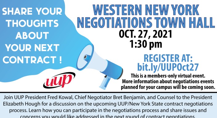 On Oct 27, 2021, at 1:30 PM, UUP will be holding a Negotiations Town Hall Meeting. Members of UUP from the Western New York chapters will be meeting virtually to take part in a vital part of our negotiations process. Join me, along with Chief Negotiator Bret Benjamin and Counsel to the President Elizabeth Hough for a discussion on the upcoming UUP/New York State contract negotiations. Learn how you can participate in the process and share issues and concerns you would like addressed in the next round of contract negotiations.